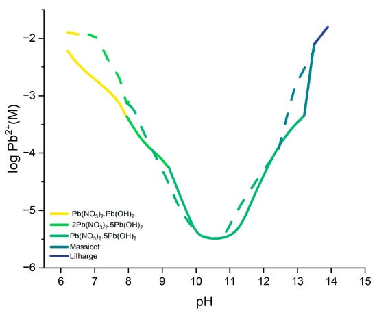 The solubilities of lead compounds at various pH values of the suspensions were investigated as shown in Figure 2, wherein the solid line uses 0.5 M lead nitrate and the dashed line uses 0.05 M lead nitrate, both at 25 °C [14]. It can be observed that the basicity in the chemical composition of the precipitated lead hydroxide nitrates increased with the increasing pH of the suspension. However, as the pH range 10.0–11.0 was reached, the solubility decreased, and a pH greater than 11.0 will lead to the formation of lead oxides such as massicot and litharge. Furthermore, this study also determined that lowering the concentration of lead nitrate shifts the pH range of formation of these lead hydroxide nitrates to a much lower value. Also, the formation of the massicot was broadened, implying that the stable phase is easily formed by decreasing the lead nitrate concentration.