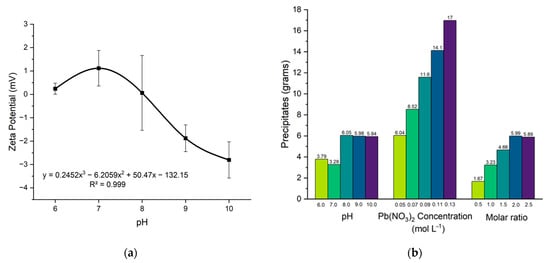 (a) The zeta potential of lead nitrate systems at varying pH levels and (b) the amount of precipitates formed with different parameters.