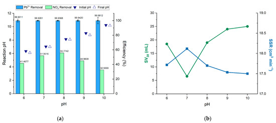 The volume of sludge generated at 30 min was measured to assess its settleability at different pH levels under consistent operating conditions, as shown in Figure 4b. For lead and nitrate removal through hydroxide precipitation, the sludge volume increased with higher pH levels but significantly decreased at pH 7.0. This decrease is likely due to the neutral pH, where the balance of positive and negative ions does not promote effective particle coagulation. Additionally, the sludge settling rate is inversely proportional to the sludge volume, and therefore the SSR consistently decreases at higher pH levels but suddenly increases at neutral pH.