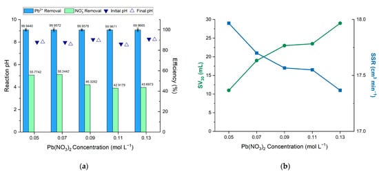 The effect of lead nitrate concentration on (a) the removal of lead and nitrate and (b) the sludge volume and sludge settling rate.