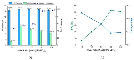 Figure 6b shows the generated sludge volume at 30 min, used to assess sludge settleability at various concentrations under consistent operating conditions. For lead and nitrate removal via hydroxide precipitation, the sludge volume increased with higher molar ratios due to the faster precipitation rate and increased formation of insoluble precipitates. However, when the molar ratio exceeded 2.0, the sludge volume decreased because of solubility effects, leading to the formation of more soluble lead species or the re-dissolution of previously formed precipitates as the pH exceeded 12 [14]. Conversely, the sludge settling rate decreased with increasing molar ratios but started to rise again at a molar ratio of 2.5, as the sludge volume began to decrease at this point.