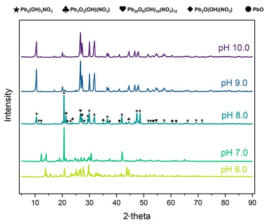 The crystals obtained at all the studied effluent pH values were subjected to X-ray diffraction (XRD) analysis to identify the crystalline structure of recovered solids and confirm the presence of lead- and nitrate-containing precipitates at these respective pH values. Raw XRD peaks were compared with the existing literature data and the Crystallography Open Database website. Across the pH range studied, the dominant peaks in the XRD patterns corresponded to lead nitrate polymorphs, namely lead hydroxide nitrate and lead oxide hydroxide nitrate, as shown in Figure 7. Major peaks of lead hydroxide nitrate (Pb2(OH)3NO3) were observed at 2θ = 10.5, 11.6, 20.6, 13.2, 29.4, 29.9, 31.8, 36.6, 41.9, 47.4, and 48.6 [4]. Additionally, different lead oxide hydroxide nitrates were also found with the chemical formula of Pb3O2(OH)(NO3) at peaks 2θ = 21.4, 23.8, 35.2, and 44.6, Pb20O6(OH)16(NO3)12 at peaks 2θ = 26.7, 27.2, and 54.7, and Pb20(OH)(NO3) at peaks 2θ = 12.3, 21.9, 28.2, 37.4, and 52.5 [18]. Furthermore, lead oxide can also be found in the precipitate at peaks 2θ = 41.0, 53.4, 60.5, and 62.1 [24,25]. The strong peaks observed at higher pH levels, like 9.0 and 10.0, were the ones containing oxide because as the pH of a system becomes higher, it is more prone to producing oxide, confirming the formation of lead oxide hydroxide nitrate instead of only lead hydroxide nitrate. These findings correspond to the study by Wang et al. [18].