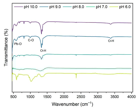 Figure 8 shows the FTIR spectra of the lead nitrate precipitates under hydroxide precipitation at different pH levels. As depicted in the FTIR spectrum, the visible peak centered at 3385 cm−1 and 1330 cm−1 pertains to the stretching and bending vibrations of the O-H band [26,27]. The O-H band indicates that hydroxyl groups are integrated into the structure of the precipitates, suggesting that the precipitates may be lead hydroxide nitrate or lead oxide hydroxide nitrate. The stretching vibration modes at 1025 cm−1 correspond to C-O, which indicates a minor contribution of CO2 dissolution from the air since the atmospheric CO2 has slightly interacted with the sample [26]. The asymmetric stretching vibration of the Pb-O bond is represented by a peak around 584 cm−1 [26,28]. The presence of this peak is indicative of lead oxide species within the precipitate, confirming that lead oxides are part of the formed compounds, and that the presence of lead oxide hydroxide nitrate is possible.