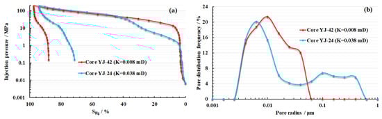 | Core No. | Permeability/mD | Porosity/% | Maximum Pore Radius/μm | Average Pore Radius/μm | Sorting Coefficient | Skewness | Homogeneity Coefficient | Maximum Mercury Saturation/% | Mercury Removal Efficiency/% |