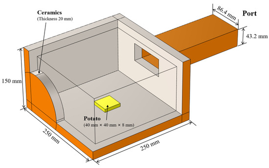 The simulation model of sweep frequency microwave heating consisted of a WR340 waveguides and one multimode cavity, as shown in Figure 1. Microwaves were fed through the WR340 waveguide with the dimension of 86.4 mm × 43.2 mm. The inner wall of the cavity was lined with a 20 mm thick layer of Al2O3 ceramic. The heated sample was a cuboid potato block on the center bottom of the cavity. The model was built in the multiphysics software COMSOL Multiphysics (6.2, COMSOL Inc., Stockholm, Sweden).