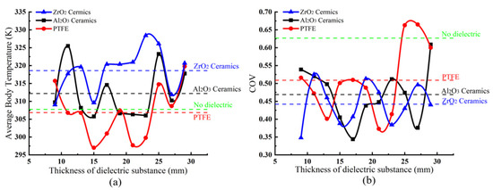 The influence of heating with different thicknesses of different dielectric substances: (a) the influence of average temperature and (b) the influence of the COV. The horizontal dash line is the average value among all of the dielectric substance.