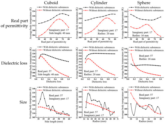 The electromagnetic power loss is , which can be gained from the computed electric field by Equation (2), and then, the temperature of the heated object can be calculated by the heat transfer equation [34,35]: