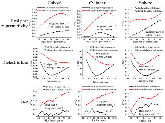 Materials with different shapes, different sizes, and different dielectric constants were studied under the above conditions and under the condition without filling the dielectric substance. Cuboids, cylinders, and spheres are used in the simulation. It is worth noting that in this simulation, the position of the load without a dielectric substance is 20 mm higher than the general one without a dielectric substance, which will lead to the load hanging in the air, but that can keep the two groups of loads (with and without a dielectric substance) having the same z-position. The comparison results for the heating efficiency of different loads are shown in Figure 11, while the results for heating uniformity are presented in Figure 12. From the comparison of heating materials of different shapes and dielectric constants, it is obvious that filling the dielectric substances can improve the heating uniformity whatever the shape, the size, and the dielectric constant of materials heated are. It is evident that the cavity with a dielectric substance generally exhibits a smaller COV. Additionally, in the vast majority of cases, the temperature rise in the cavity with the dielectric substance is higher than that in the cavity without it, although there are a few exceptions when the size of the load changes. Therefore, it can be concluded that using a dielectric substance during sweep frequency microwave heating can improve heating uniformity and efficiency, but it does not necessarily lead to an increase in heating efficiency. This simulation proves that other materials with different dielectric constants and shapes can also be heated more uniformly by the proposed methods.