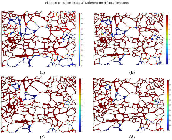 Under the same temperature and pressure, the interfacial tension of porous media will change because of the change in CO2 concentration [13]. When the interfacial tension in the CO2 oil rock system is very high, CO2 occupies less pore space and migration path. However, a low interfacial tension in a reservoir will easily allow CO2 to penetrate through the porous media in the middle of pores or pore throats. Figure 11 shows the spatial distribution of CO2 saturation in porous media at T = 0.1 s (a,b) and 1.0 s (c,d) after CO2 injection under the conditions of high interfacial tension (27 mN/m) and low interfacial tension (20 mN/m). It can be seen that CO2 saturation is relatively low under high interfacial tension (27 mN/m) because high interfacial tension corresponds to higher capillary pressure, and a too-high capillary pressure will hinder the flow of CO2 in the pores. However, the CO2 distribution range in both cases is roughly the same.