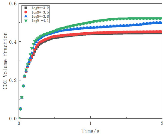 Figure 15 shows the CO2 volume fraction under different viscosity ratios. It can be seen that the viscosity ratio increases. With the increase in CO2 viscosity, the wettability of rocks increases, and the overall displacement spread range also increases. CO2 is also more widely distributed, indicating that is at a high viscosity ratio. The displacement effect of CO2 will be significantly improved. At low contact angles, it is difficult for CO2 to diffuse effectively. And at a low viscosity ratio, wettability is smaller, and the resistance is greater, making CO2 migration more difficult [16]. At the viscosity ratios of logM = −3.8 and logM = −4.1, the final stable CO2 volume fraction is about 0.45. At the viscosity ratios of logM = −3.2 and logM = −3.5, the final stable CO2 volume fraction is about 0.5.