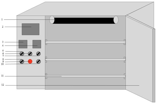 The fresh broccoli rhizomes were washed and cut into cubes about 1 × 1 cm in size. Each group of 60 g broccoli rhizomes was weighed and placed on a tray and dried in a far-infrared drying oven (DHG-9023A, Wujiang Yonglian Machinery Equipment Factory, Suzhou, China), as shown in Figure 1. The drying temperatures were set to 60, 65, 70, 75 and 80 °C, respectively. The mass was measured every 10 min in 0~0.5 h, every 15 min in 0.5~1 h, every 30 min in 1~2 h, and then every 1 h. When the moisture content of broccoli rhizome decreased to 10%, the drying was stopped. To ensure the rigor of the experiment, each group of experiments was repeated three times and the average value was taken. The dried broccoli rhizomes were crushed and passed through a 60-mesh sieve and stored in a refrigerator at 4 °C for subsequent analysis of physical and chemical properties.
