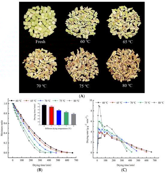 Effects of different temperatures on appearance (A), moisture ratio (B), and drying rate (C) of broccoli rhizomes.