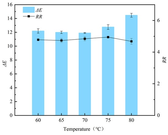Color is one of the important quality indexes to evaluate the quality of dried broccoli rhizome products. The smaller the ∆E value is, the closer the color of the dried product is to the fresh state, and the better the quality is []. The L value of fresh broccoli rhizome was 72.11 ± 0.1. The a value was 4.688 ± 0.25; the b value was 17.9 ± 0.49. The color changes of the broccoli rhizomes under far-infrared drying at different temperatures are shown in Figure 3. The results showed that the temperature had a significant effect on the color of the broccoli rhizomes (p < 0.01). When the temperature was in the range of 60–70 °C, the ΔE values were 12.20, 11.99 and 11.9, respectively, and the color change was small. When the temperature rose to 75 °C and 80 °C, the ΔE value changed greatly, and the color change was more obvious. On the one hand, the reason for this phenomenon may be that the higher the temperature, the greater the impact on anthocyanin, vitamins and other heat-sensitive substances in the broccoli rhizomes, resulting in its decomposition, and the ΔE value changes greatly []; on the other hand, it may be that the higher the temperature, the stronger the Maillard reaction inside the broccoli rhizome, which reduces the brightness of the dried product, resulting in a large change in color difference [].