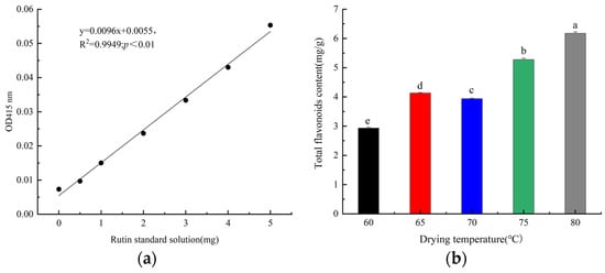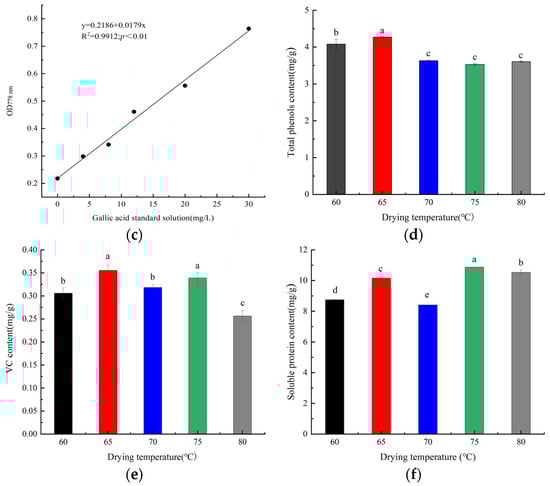 The drying temperature had a significant effect on the nutritional quality of the broccoli rhizomes. Figure 4a shows the standard curve of rutin, the regression equation is y = 0.0096x + 0.0055, R2 = 0.9949; Figure 4c shows the standard curve of gallic acid, the regression equation is y = 0.0179x + 0.2186, R2 = 0.9912. The mass concentration of rutin and gallic acid had a good linear relationship with absorbance. According to the data of Figure 4b,d,e, the total flavonoid content was 2.93 ± 0.03, 4.13 ± 0.02, 3.94 ± 0.02, 5.28 ± 0.05 and 6.17 ± 0.05, respectively. There were significant differences between the different temperature treatment groups. Studies have shown that the content of total flavonoids is only partially degraded in the moderately dry (60–100 °C) temperature range, but high temperatures will also destroy the cell structure of broccoli rhizomes, thereby improving the ability to extract total flavonoids, resulting in an increase in content with an increasing temperature, which is consistent with the results of Tang et al. [] in the extraction process optimization and content comparison of total flavonoids in different types of tea. When the temperature increased from 60 °C to 65 °C, the total phenol content increased and reached the maximum at 65 °C. The reason for this phenomenon is that the increase in temperature may lead to partial damage to the cell structure and contribute to the release of phenols. However, as the drying temperature continues to increase (70, 75 and 80 °C), thermal decomposition becomes the dominant process, and some phenolic compounds begin to degrade due to thermal instability, but this degradation may gradually tend to be stable in a higher temperature range, resulting in no significant change in total phenolic content at 70, 75 and 80 °C []. The preservation rate of VC content in the dried broccoli rhizome products of the five temperature treatment groups was low, probably because VC had strong reducibility, was very unstable under high-temperature conditions, and was easily decomposed. In this study, the drying temperature was 60–80 °C, and most of the VC was decomposed, resulting in less VC content in broccoli rhizome-dried products.