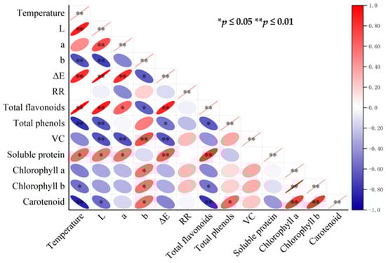 The Pearson correlation between the drying temperature and the indicators of dried broccoli rhizome products is shown in Figure 5. The results showed that there was a significant positive correlation between drying temperature and L, ΔE and total flavonoid content (p < 0.01), a significant negative correlation between drying temperature and b, total phenolic content and carotenoid content (p < 0.01), a positive correlation between drying temperature and soluble protein content (p < 0.05), and a negative correlation between drying temperature and chlorophyll b content (p < 0.05). There was a certain correlation between drying temperature and a, VC content and chlorophyll a content, but the correlation between drying temperature and RR was not strong. The results were consistent with the results of Li Yannian’s study on the correlation between the drying process and the quality of Salvia miltiorrhiza extract, and there was a certain correlation between drying temperature and nutritional quality [].
