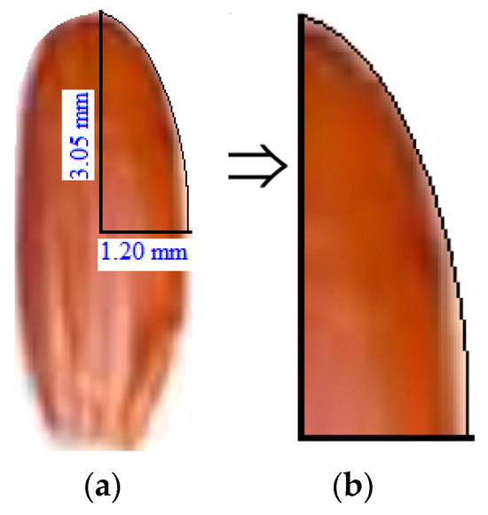 (a) A photograph of a grain of husked red rice highlighting a quarter of the flat area; (b) contours of the flat area to generate a mesh for half a grain.