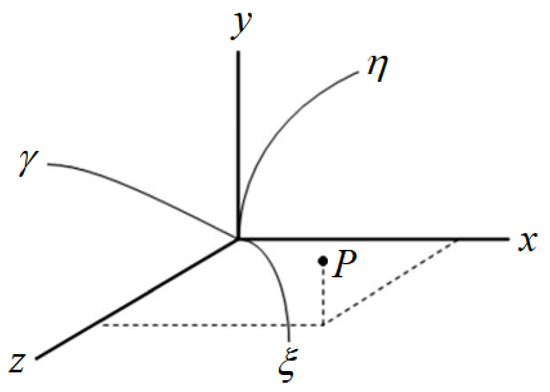 Thus, a point P with coordinates () can also be located in generalized coordinates () through appropriate correspondences, generically given by the following [51]: