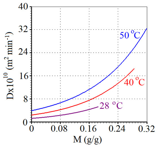 The three mass diffusivities as a function of the local moisture content are given, now, by Equation (10), with the values of a and b provided in Table 1. Thus, for each temperature, the water diffusivity as a function of the local moisture content can be visualized in Figure 4.