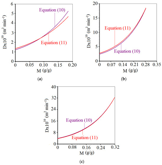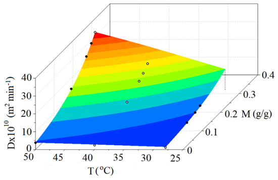 As can be seen in Figure 12, there is a good agreement between Equations (10) and (11), particularly for temperatures in the vicinity of the region between 40 and 50 °C. In this context, Equation (11) seems to be valid in obtaining D(M) in the region close to 40–50 °C.