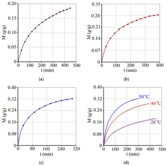Kinetics of water absorption by husked red rice at the following temperatures T: (a) 28.0 °C (magenta); (b) 40.0 °C (red); and (c) 50.0 °C (blue). (d) The superpositions of the three kinetics.