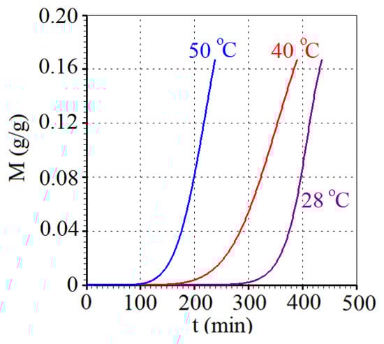 The moisture absorption kinetics at the central point of the husked red rice grain (the chosen node, that is, the control volume in blue shown in Figure 3) can be obtained with the proposed model, and it is shown to have a moisture content of up to 0.167 gwater/ginitial matter for all temperatures, as shown in Figure 7.
