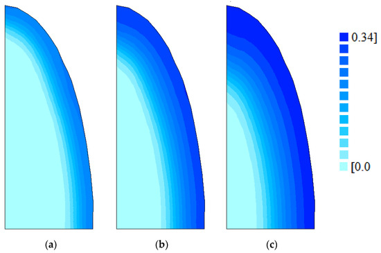 The appropriate boundary conditions for the flat area shown in Figure 3, whose rotation represents half a grain of red rice, are as follows: zero water flux, , to the west and south boundaries (boundary condition of the second kind) due to the symmetry; and zero resistance to water flux for the north and east boundaries (boundary condition of the first kind). It is interesting to note that, although the third kind boundary condition has already been used to describe water transfer in rice [36], the boundary condition of the first kind for grains immersed in an aqueous medium (or in dry air) is the most frequently found in the literature [7,30,32,42,48]. It is important to highlight that, based on the results obtained by Balbinoti et al. (2018) [36], the Biot number for water transfer is greater than 100, meaning, in practical terms, the first kind boundary condition (not third kind boundary condition).
