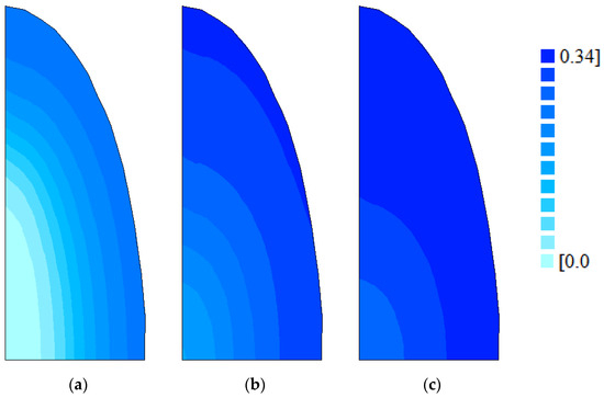 As already noted in Section 1, it is very common to find studies using diffusion models to describe water migration in an agricultural product in which the mass diffusivity is considered constant at a given temperature [9,25,30,43,46,48]. On the other hand, Bakalis et al. (2009) [48] proposed a model with variable mass diffusivity as a function of the average moisture content at each time instant. However, when these authors presented the moisture distribution inside a grain, during the transient process, it became clear that, for a given instant, the water distribution within the grain was completely heterogeneous before the equilibrium. Therefore, considering the “average” moisture content does not seem to be the best choice for the model, but rather the local moisture content. In the present article, Figure 8 and Figure 9 clearly show that during the transient state, for a given time, there is a low concentration of water in the central region of the grain, which increases towards the surface of the product. This behavior indicates that mass diffusivity really must be a function of the local moisture content, as proposed in this article for rice, and as already proposed by some researchers for other products [35,45,65].