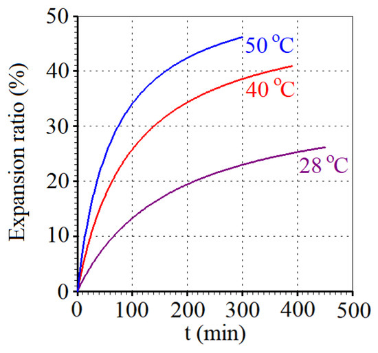 Regarding the kinetics of volumetric expansion, during immersion, several studies are available in the literature on the subject, such as the works of Hu et al. (2021) [18] and Hu et al. (2020) [44]. In these articles written by Hu and his collaborators, it is possible to observe that the expansion ratio of each rice grain varies, for different rice genotypes, from the initial volume up to the equilibrium volume, reaching maximum values close to 50%. In the present research, the expansion ratio varied from 26.5% (28.0 °C) to 46.3% (50.0 °C), and such results agree with those from the literature [18,44].