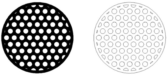 The typical automotive cylindrical monoliths have diameters (Dm) of 100 mm and lengths (Lm) of 150 mm [38]. These dimensions were also considered in our example of designing and dimensioning of an automotive SCR-deNOX catalyst. The share of effective flow area (Sheff) was assumed to be equal to 0.6 to account for the thickness of the monolith’s walls which enable its structural integrity, load bearing capacity, and mechanical resistivity. The arrangement of the channels in the monolith catalyst was expected to follow the hexagonal-lattice-based circle packing pattern (of equally sized circles), which has been used in monoliths [39] and can be seen in Figure 1 [39]. The hexagonal-lattice-based circle packing is the densest circle packing in the plane with a packing density equal to [40]. This circle packing density is of course a theoretical limit, which, if applied to our case, would mean that the monolith’s walls would have zero thickness and the monolith would have no extra material near its outer edges. Therefore, a considerably lower value than the 0.9069 theoretical limit was selected for the share of effective flow area (Sheff).