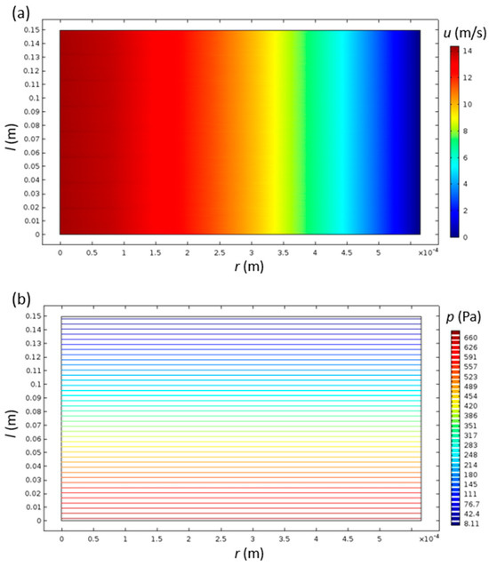 The velocity field was, as expected, unchanging with the axial direction of the channel, since the inlet velocity profile inserted as the boundary condition was already parabolic—a fully developed laminar flow (Figure 2a). The pressure inside the monolith channels monotonically decreased with increasing channel length, while it had close to zero variation in the radial direction (Figure 2b). This type of spatial pressure variation is typical for laminar flow inside a channel.