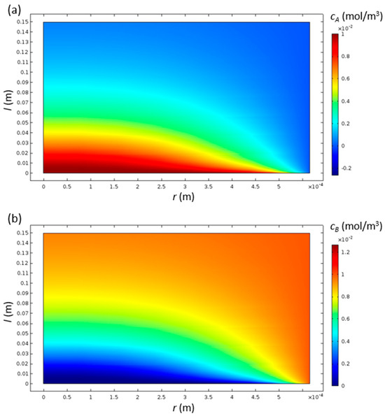 Contours of concentrations of species A (a) and B (b) inside the cylindrical monolith catalyst channel with R = 0.565 and L = 150 mm.