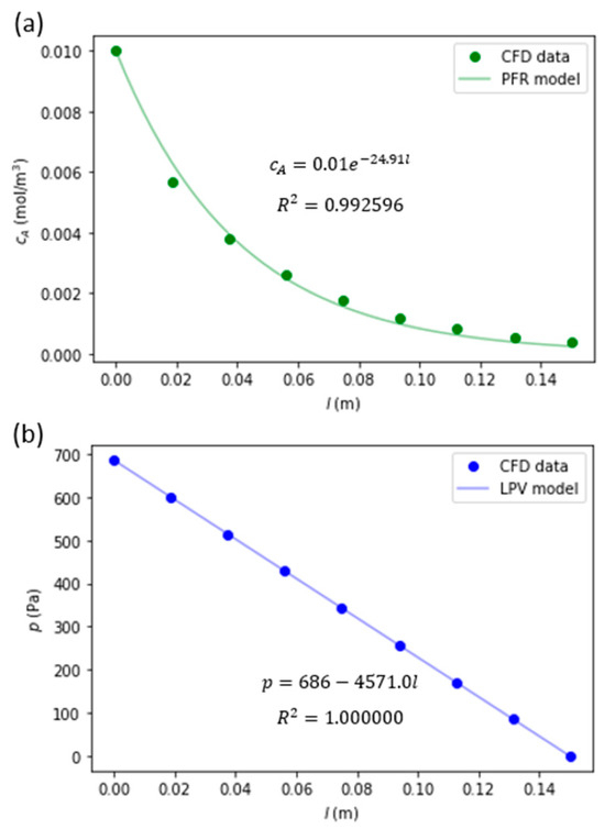 Model order reduction fitting results of cA (a) and p (b) for the cylindrical monolith catalyst channel with R = 0.565 and L = 150 mm.