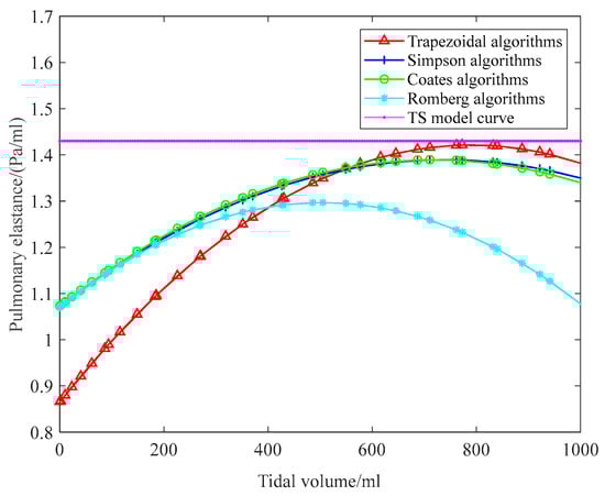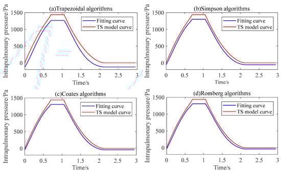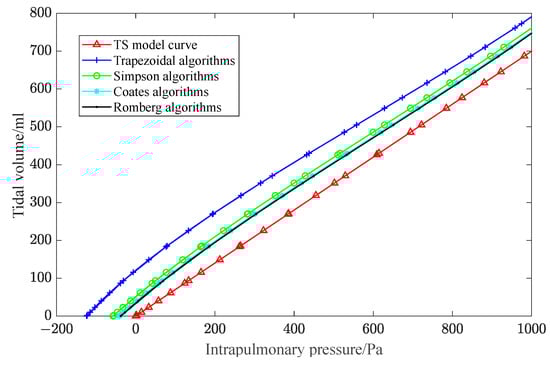 The relationship curves between tidal volume () and fitted intrapulmonary pressure () by four numerical integration algorithms are presented in Figure 4. The value of the TS respiration model curve corresponds to the “tidal volume curve” and the “intrapulmonary pressure curve” in Figure 1.