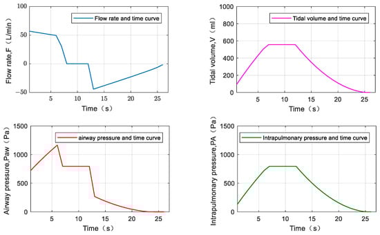 In the literature [11,12,13], a time-switching mechanical ventilation piecewise model is established based on fluid mechanics theory. This model, hereinafter referred to as the TS respiration model, includes a flow velocity equation, a flow rate equation, a tidal volume equation, an intrapulmonary pressure equation, and an airway pressure equation. Pulmonary elastance is defined as a constant. By setting ventilator parameters, simulation results for airway pressure, tidal volume, and static pulmonary pressure at the end of the ventilator pipeline can be obtained. The simulation results of the TS respiration model are consistent with the experimental measurement results, verifying its accuracy.