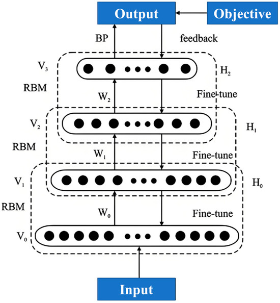 In the formula, the superscript k represents the number of sampling iterations, and represents the learning rate. The DBN is a probabilistic generative model constructed by “stacking” several RBMs, where the hidden layer of one RBM serves as the visible layer of the next RBM. A typical DBN network architecture consists of several layers of RBMs and a logistic regression layer (usually a classifier), forming a deep neural network. Its structure is illustrated in Figure 1.