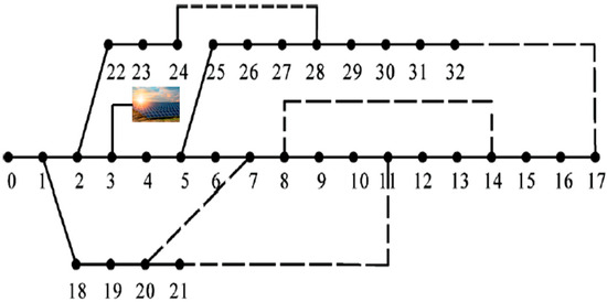 Taking a 33-node distribution network system with an ESS (energy storage system) and distributed photovoltaic (PV) generation in a certain location as an example, the line voltage level is 12.66 kV. Its network topology is shown in Figure 2, where solid lines represent the original system branches, and dashed lines represent the tie switches that can be reconfigured. This paper does not consider the sale of electricity, and excess PV generation is fully absorbed by the ESS. The national PV subsidy reference is based on the 2023 national subsidy policy for PV generation, with a distributed electricity price subsidy standard of 0.42 yuan per kWh. According to the optimization model under the initial system, the relationship between the annual planning cost and the PV access capacity is determined, and the PV access capacity with the lowest cost is specified as the original PV access capacity, which is 2648 kW at this time. The installation location of the distributed PV is at node 3.