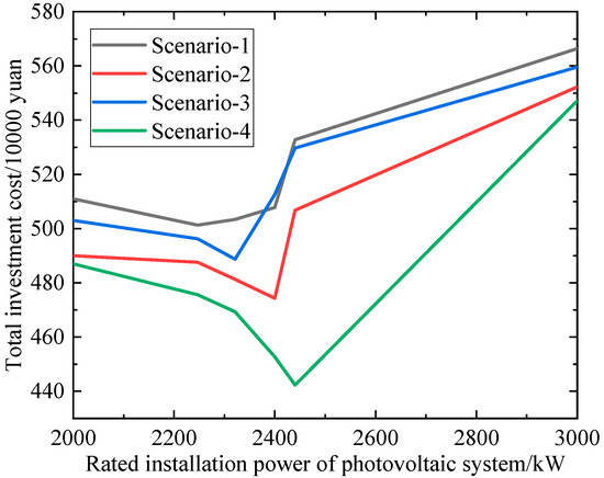 Based on the initial capacity determination principles outlined in the first section, “distributed photovoltaic power generation output-annual planning cost” curves under different scenarios were plotted, and a comparative analysis was conducted on the annual planning costs and initial planning results for photovoltaic access capacity in each scenario, as shown in Figure 5. Taking Scenario 1, which does not adopt any active distribution network strategies, as the baseline, it is assumed that the distributed photovoltaic power generation and ESS are connected to each node evenly, ignoring the impact of network loss variations and node voltage level changes caused by different node access capacities. After considering only the bidirectional reconfiguration strategy or the demand-side response strategy, the lowest point of the cost curve shifts, with the planning cost at the lowest point dropping to 4.887 million yuan and 4.743 million yuan, respectively, and the photovoltaic access capacity increasing to 2321 kW and 2402 kW. Compared to other scenarios, the trough value of the cost curve in Scenario 4 further reduces the planning cost to 4.423 million yuan, and the corresponding rated installed capacity of distributed PV power generation increases to 2420 kW. This demonstrates that considering both demand-side response and bidirectional dynamic reconfiguration strategies has a positive impact on reducing planning costs and improving photovoltaic accommodation levels.