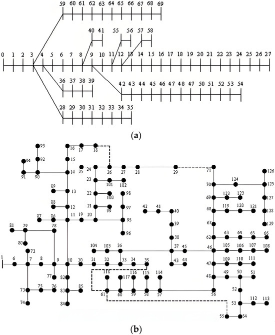 Topologies of testing systems with different scales. (a) Topology of IEEE-69 node testing system. (b) Topology of IEEE-123 node testing system.