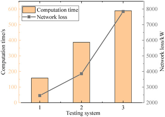 By observing Figure 7, it can be seen that as the testing system scale increases, both the solution time and network losses also increase. Large-scale systems typically exhibit characteristics such as immense size, complex structures, diverse objectives, and numerous influencing factors. This necessitates that the energy storage configuration strategy fully considers the intricate relationships within the system and the interactions between different factors. Large-scale systems involve vast amounts of data, including real-time and historical data from various aspects such as power sources, loads, and energy storage. Processing these data requires significant computation time. Additionally, in large-scale systems, the economics of energy storage configuration become even more crucial. Due to the high investment costs associated with energy storage systems, it is imperative to minimize the configuration costs, while satisfying the demand. This requires the energy storage configuration model to comprehensively consider various economic factors (such as investment costs, operating costs, revenues, etc.) for economic evaluation.