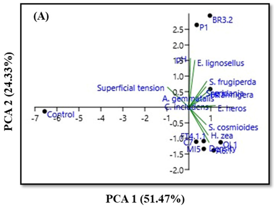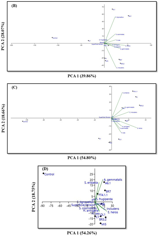 Figure 1A indicates the distribution of mortality of the nine insect pests and the physicochemical variables for the crude broth treatments. PC1 explained 51.47% of the measured variation. All treatments indicated a positive correlation with the variables investigated for the crude broth. The second component, responsible for 24.33% of the total variation, was associated only with the control treatment, which showed a negative correlation with the variables studied. The same scenario was observed for treatments at dilution n × 10−7 (Figure 1D), in which the first and second components explained 54.26% and 18.75% of the variation.