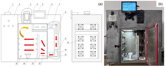 Schematic diagram (a) and photo (b) of the humidity-controlled hot-air drying system. 1—Raspberry Pi control component, 2—control box, 3—industrial camera, 4—light source, 5—control screen, 6—drying chamber, 7—air return pipe, 8—heating pipe, 9—centrifugal fan, 10—exhaust pipe, 11—water tank, 12—humidification device, 13—turbulence fan support frame, 14—weight sensor, 15—dehumidification fan, 16—turbulence fan. Reproduced with permission from Samir et al. [20], Innovative Food Science & Emerging Technologies; published by Elsevier, 2024.