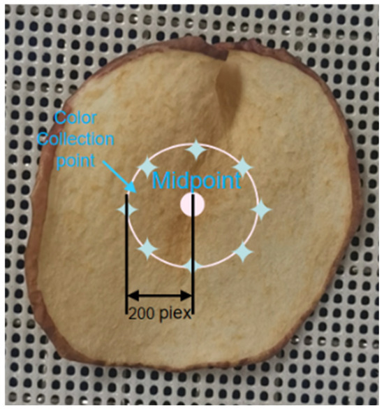 The image of apple slices undergoing drying was segmented in real-time using the DeepLabV3+ [25] semantic segmentation model embedded inside the device, as illustrated in Figure 2. This process yields the region of the apple slices indicated in the image, taking the center of the region as the midpoint; coordinates were taken at eight points (all 200-pixel values away from the midpoint) and denoted as R, G, and B values uniformly around the region in Figure 3, which were then converted into (light/dark), (red/green), (yellow/blue), and the total color difference ΔE was calculated according to Equation (4) [26]: