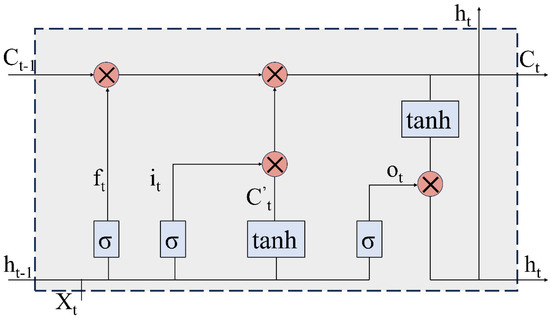 LSTM, as a distinctive recurrent neural network (RNN) structure, plays a pivotal role in addressing time-series issues and can effectively resolve gradient vanishing and gradient explosion concerns [30]. The cell model structure is illustrated in Figure 6. The three gating units represent the input, output, and forget gates. The formulas for the three gating units are presented below (7)–(12):