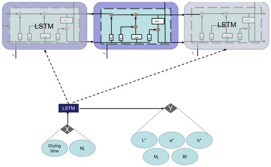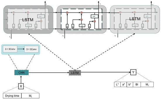 A CNN-LSTM neural network [32], depicted in Figure 8, was utilized to forecast apple slices’ color and moisture content during drying under various conditions. The CNN-LSTM model consists of one input layer, three hidden layers, and one output layer, along with a PReLU activation layer and Dropout to enhance nonlinearity and prevent overfitting. The integration of CNN and LSTM involves using CNN to extract local features from the data, which are then passed to LSTM to capture long-term dependencies over time, achieving comprehensive feature extraction and sequence modeling.