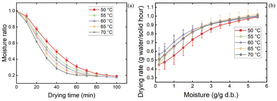 The drying rate (g water/(g solid·h)) (DR) is the quantity of water evaporated per unit of time. DR of apple slices was calculated according to the methodology outlined in Equation (3) [24]: