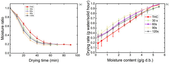 Figure 10a illustrates the variation in the MR of apple slices with drying time at 60 °C under different blanching times and under THC conditions. Until the moisture ratio of the apple slices reached 20% (w.b.), the moisture content did not continue to decrease with time, and the endpoint was not reached. Similar findings were also observed in the study of [34]. Figure 10b demonstrates the drying rate of the apple slices, showing that the blanching time significantly affects the drying rate of apple slices. The time required to reach the drying endpoint decreased with the increase in blanching time in the range of 30 to 90 s. This may be attributed to the exclusion of air from the apple tissues during blanching, which ruptures the cell wall and thus increases the permeability of the cell membrane, thereby promoting the diffusion of water [38,39].
