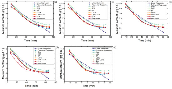 Results of predicted moisture content by models at (a) 50 °C, (b) 55 °C, (c) 60 °C, (d) 65 °C, (e) 70 °C.