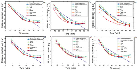 Results of predicted moisture content by models at (a) 30 s, (b) 60 s, (c) 90 s, (d) 120 s, (e) THC, (f) 120 s + THC.