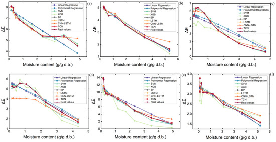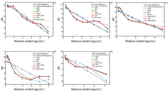 Results of predicted ΔE by models at (a) 50 °C, (b) 55 °C, (c) 60 °C, (d) 65 °C, (e) 70 °C.