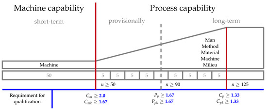 Since the primary purpose of SPC is to provide statistically significant evidence of the entire production process based on an inherent quality criterion, specific characteristics related to the process are defined to calculate the quality of the process. The quality criterion is associated with individual tolerance limits, namely the upper tolerance limit (UTL) and the lower tolerance limit (LTL), which determine whether the manufactured workpiece should be classified as rework or scrap if it exceeds or falls short of these limits [10]. To avoid the cost-intensive measure of 100% quality control in series production, descriptive indices such as process potential () and process performance () are computed based on random samples drawn to assess the quality characteristic of the products produced. This allows for statistically significant conclusions to be drawn regarding compliance with the tolerance limits for the entire population. Moreover, by using different sample sizes, adjusted assessments of the influences of factors such as human, material, method, and environment on the process can be made [11]. When a sample size of 50 is used for the calculation, the defined metrics are machine capability () and machine potential (), which assumes a less powerful statement about the capability. Herein, only 1 M (Machine) is under control, whereas a higher sample size assumes more influence (5 M) is under control (in addition to Machine: Man, Method, Material, and Milieu). In each case, the potential is interpreted by comparing the tolerance limits to the spread. The capability indices further relate the scatter width to statistical position parameters, enabling the determination of both the process variation and the quantity of defective parts produced [2].
